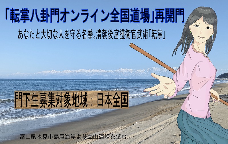 本当に使える武術・護身術を望む者よ。大切な人をその手で守りたいと思う者よ。最大のチャンスが訪れた。あなたは稀代の武術に気づいた。そして稀代の武術を再興させた、大きな源と、時を同じくして生きている。同じ国に生きている。転掌再興祖がこの日本国にはいる。武術の真のマスターとなり、マスターとして人生を歩み、マスターとして後世にその足跡を残したいのであれば、いますぐ金沢のグランド・マスターと共に進め。