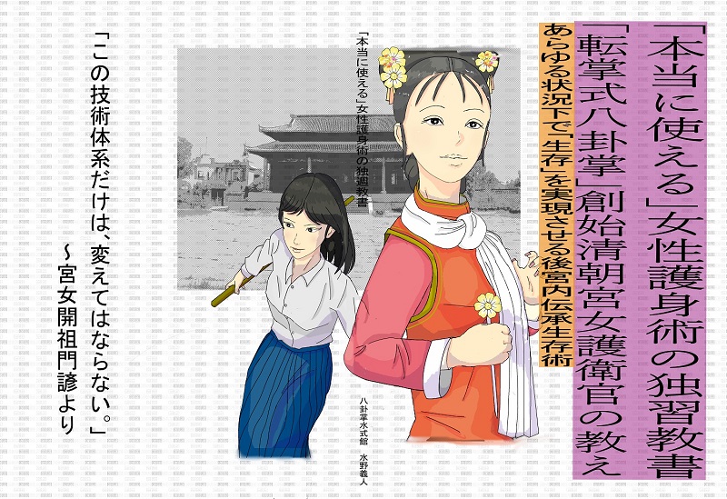 董海川先師が、楊家宮女開祖に伝え、楊家拳となり、いつしか家伝武術の状態となっていたのである。門諺によると、宮女開祖は、その技法を福建省にて門戸を広くし伝えようとしたが、時勢によりないがしろにされ、失意のままに世を去った。その無念が楊家に鮮烈な記憶として伝わっていたのである。10月に発刊した『「本当に使える」女性護身術の独習教書』の裏表紙に